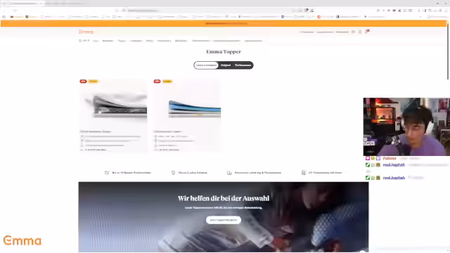 00:23:58Der Streamer bewirbt intensiv ein Schlafoptimierungs-Set von Emma, bestehend aus Matratzen, Toppern, Kissen und Decken. Er teilt persönliche Erfahrungen: Das Elite-Stützkissen und die Gewichtsdecke (vergleicht sie mit einem 'VW Polo') hätten sein Schlafverhalten positiv verändert, insbesondere für 'Beinewackler'. Er beschreibt den Topper als zusätzliche Komfortschicht und empfiehlt die Produkte unter Hinweis auf Rückgaberecht und Support des Streams. Die Partnerschaft wird als großer Shoutout präsentiert, wobei er auch auf Sommer-/Winterdecken und Schlafsofas hinweist.