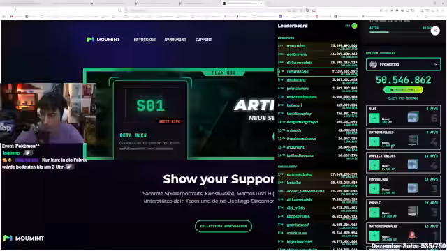 00:19:30Es wird eine neue 'Moumint'-Season vorgestellt, die auf Hues (Rarity-Werten) basiert. Das Spielprinzip startet mit Blauen, geht über seltene Stufen zu Lila und Magenta, bis hin zum wertvollsten Goldenen, um das zuvor ungleiche Wertgefühl der Rarity-Stufen zu korrigieren. Der Streamer demonstriert das System, zeigt seine gesammelten Hues (100er Blue, Top 1%) und erklärt die geplante Einführung von Divisionen für Community-Wettbewerbe. Kern ist die Gamification von Support: Durch das Sammeln von Momenten (an Stream-Ereignisse angelehnte Collectibles) können Zuschauer Punkte für die Community sammeln, die in Ranglisten führen und Top-Teilnehmern physische Belohnungen (Plates) einbringen.