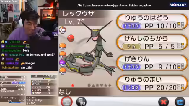 00:41:42Die Durchsicht des Pokémon X-Spielstands von 'Akitan' (342 Pokémon, 37h Spielzeit, 8 Orden) offenbarte ein Shiny Rayquaza im Jubelball mit der ID 03172. Nach Recherche mittels Google Lens und Event-Datenbanken wurde dies als legitimes Event-Pokémon von 2012 (Pokémon plus Nobunagas Ambition Tie-In) identifiziert, ursprünglich aus der Einallregion (Schwarz/Weiß). Das Rayquaza (Level 70, Nature: +Spez.-Ang./-Ang., Fähigkeit Air Lock) wurde während des Spielens genutzt und stellt einen bedeutenden Fund dar. Zusätzliche Pokémon im Team (Atmurai, Hariyama, Fritzlblitz, Kyurem) und Handelskontakte ('Juta', 'Kagura') wurden diskutiert.