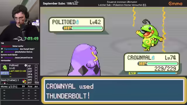 03:44:22Er stellt fest, dass er zum Healen nicht alles benötigt und öffnet eine Tür, um alles einfacher zu machen. Er sucht nach dem Teleporter und findet ihn schließlich. Er kommentiert das Moveset eines Pokémons und wundert sich, warum es so selten benutzt wird. Er erklärt, dass Pokémon auf der Meta-Ebene existieren, bevor sie einen Typ haben. Er bemerkt einen Identitätsdiebstahl und findet ein Item. Er bedankt sich bei Ramletha und Valentine für ihre Unterstützung. Er kommentiert einen Cyclist Thomas und stellt fest, dass er nur dank Sacred Fire einen Vorteil hat. Er erwähnt einen Befehl, um die Regeln der Challenge zu sehen. Er kommentiert einen Affen, der zu oft vorkommt, und Psywave, das random Schaden macht. Er stellt fest, dass sein Beutel voll ist und er zwölf Trainer vermisst. Er nimmt versehentlich den Teleporter und versucht, in der Reihenfolge durchzugehen. Er muss dringend speichern und kommentiert den entspannten Boss-Cosplay.