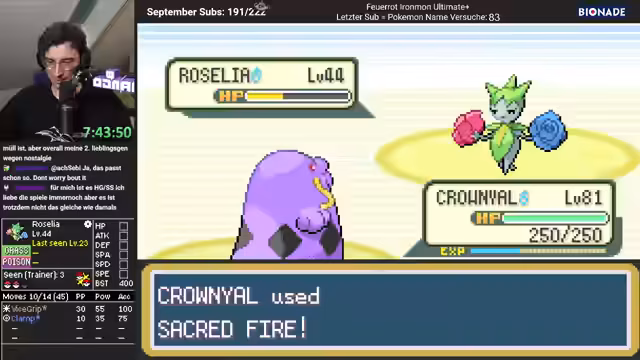 04:12:35Der Kampf gegen Sabrina beginnt. Der Streamer agiert sehr offensiv und setzt mehrmals Sacred Fire ein, um ein Pokémon nach dem anderen auszuschalten. Die Pokémon der Arenaleiterin, insbesondere ein Magneton mit Fake Tears, stellen eine unerwartete, aber dennoch bewältigbare Gefahr dar. Nachdem Sabrina besiegt ist, wird der Erfolg analysiert. Der Streamer bewertet den Run als sehr glücklich, insbesondere wegen der Stats und des Movesets seines Schluckp. Gleichzeitig bleibt skeptisch, ob das Pokémon in den kommenden, schwierigeren Kämpfen bestehen kann.