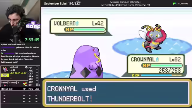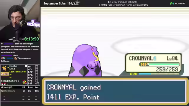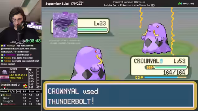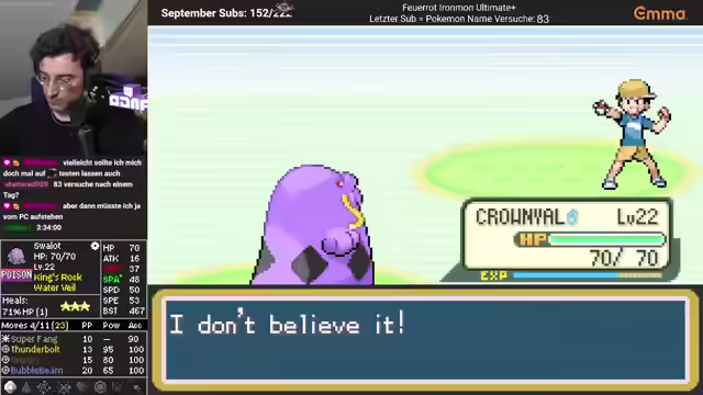 00:05:13Der Stream beginnt mit einer Begrüßung und der Hoffnung, dass die Zuschauer nicht das Haus verlassen haben. Es wird über Einkäufe gesprochen und die Maßeinheit 'Kegelrobbe' für Größe eingeführt. Der Streamer erwähnt einen Cliffhanger und freut sich über die Formatierung des Streams. Es wird ein Dank an Geisen für sechs Monate und an Peter Woller für Spenden ausgesprochen. Es wird die Möglichkeit eines Scheiterns am heutigen Trainer angesprochen, trotz eines gut aufgestellten Schlupfwegs. Der Streamer spricht über mangelnde Motivation für verschiedene Aufgaben und vergisst den Timer, der auf 17:22 Uhr gestellt wird. Die Zahl 334 wird erwähnt, und es wird festgestellt, dass ein Pokémon Volt Absorb besitzt. Destiny Bond wird vermieden. Der Streamer stellt fest, dass dies der erste Run ist, der so weit gekommen ist.