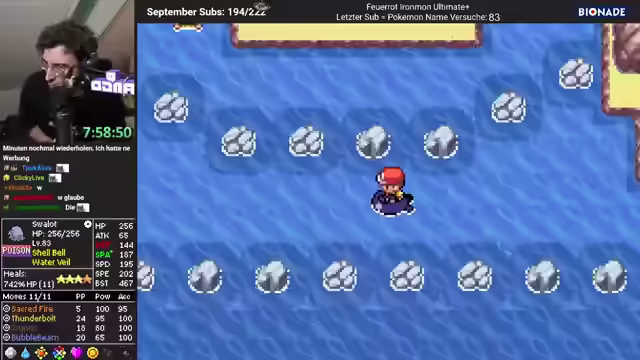 00:11:55Es wird festgestellt, dass einige Zuschauer pünktlich zum Stream erschienen sind. Der Streamer spricht über die Qualität des aktuellen Pokémon und testet dessen Grenzen. Einkäufe werden auf später verschoben. Es wird erwähnt, dass Stami ausgetauscht wurde, da es sich um eine Stone Evo handelt, die nur vier Attacken hat und somit im Prison relativ nutzlos ist. Der Wal (Kyogre) wird als Legendary zu den Favoriten hinzugefügt, und es wird das erste Special Death Monster des Seeds gefunden. Superzahn wird als nützliche Attacke für solche Pokémon angesehen. Es folgt ein kurzer Checkup der Musikpräferenzen der Zuschauer und ein Hinweis auf ein Ado-Konzert, das der Streamer besucht hat. Es wird überlegt, ob ein Legendary ins Team soll. Es wird ein tankiges Wiesel gelobt und die Moves des Pokemons hervorgehoben. Der Streamer ist von dem Pokémon angetan und will es tuxiden sehen.