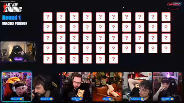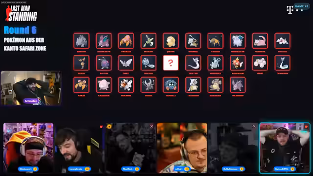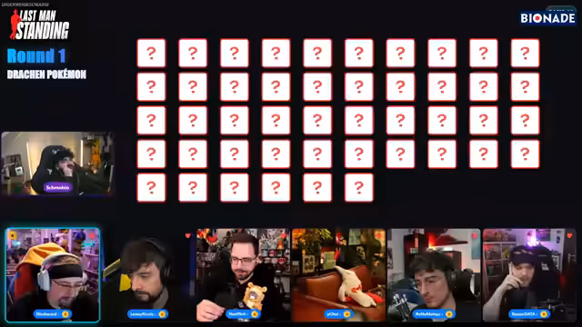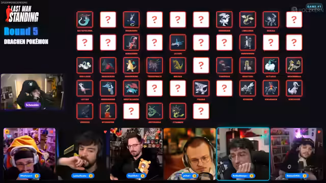 01:37:54Die nächste Kategorie ist 'Last Man Standing', bei der die Teilnehmer nacheinander passende Pokémon zu einem Oberbegriff aufzählen müssen. Die erste Kategorie sind Drachen-Pokémon. Dalu scheidet früh aus, da er Dragoran nicht auf der Liste findet. Lenny nennt Rayquaza und Seekrom, aber es scheint ein Problem mit der Liste zu geben, da einige Pokémon fehlen. Das Spiel wird vorübergehend unterbrochen, um technische Probleme zu beheben. Anschließend wird ein neues Spielformat eingeführt, bei dem eine Kategorie und eine Zahl zwischen 1 (unmöglich/unnütz) und 10 (OP/lecker) gegeben werden. Die Teilnehmer müssen ein passendes Pokémon nennen, und die anderen Spieler müssen die Zahl erraten. Mango muss ein Pokémon nennen, das er im 1 gegen 1 besiegen könnte, und wählt Jungglut für die Zahl 5. Die anderen Spieler raten 4, was einen Punkt Abzug bedeutet, da die korrekte Zahl 3 war.