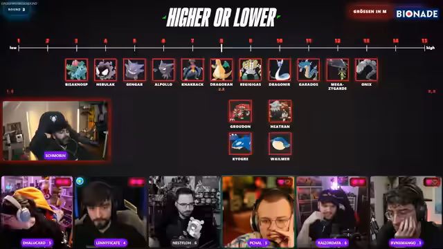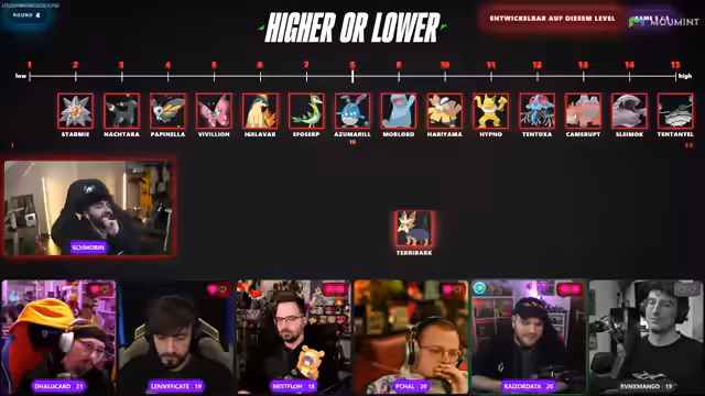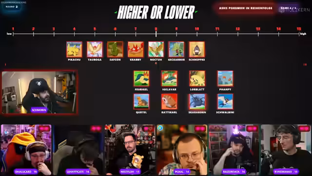 04:15:46Nach dem Pokémon Quiz wird ein neues Spiel namens 'Higher or Lower' eingeführt, bei dem Pokémon-Attribute wie Pokédex-Nummer, Größe und Initiative-Wert in aufsteigender oder absteigender Reihenfolge sortiert werden müssen. Die erste Kategorie sind die Pokédex-Nummern, bei der die Spieler zwei Leben haben. Es beginnt mit Pokémon wie Abra, Dummisel und Flunkiefer, die korrekt eingeordnet werden. Die Herausforderung steigt mit Pokémon wie Kangama, Azurill und Evoli, wobei die genaue Platzierung in der langen Reihe immer schwieriger wird. Fehler führen zum Verlust eines Lebens, was die Spannung erhöht und die Spieler dazu anregt, ihr Wissen über die Pokémon-Welt zu testen.