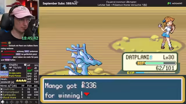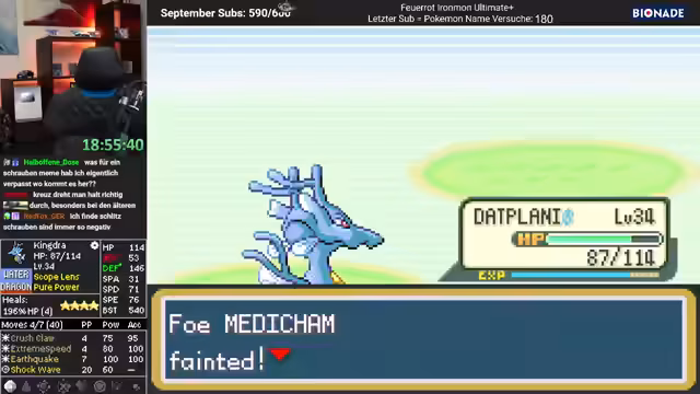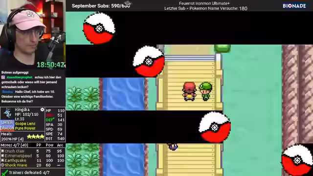 02:45:06Ein schwieriger Kampf im Felstunnel gegen einen Ninja-Trainer zwingt zu strategischen Entscheidungen. Der Trainer setzt Attacken wie Knochenkeule, Knochenhatz und Verwurzler ein, was zu Ressourcenknappheit führt. Es wird überlegt, die Attacke Verwurzler mit Sketch zu kopieren, um den Kampf zu gewinnen, da keine Bälle mehr vorhanden sind. Nach mehreren Versuchen und dem Einsatz von Heilitems gelingt es, den Kampf zu überstehen. Es stellt sich heraus, dass das Festhalten an der One-Shot-Dungeon-Regel die Situation zusätzlich erschwert. Nach dem Sieg werden die restlichen Trainer im Felstunnel bekämpft, wobei der Einsatz von Attacken wie Lehmschelle und Hyperstrahl in Betracht gezogen wird. Letztendlich wird die Hölle des Felstunnels überstanden, jedoch mitgenommen und erschöpft.