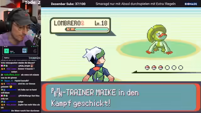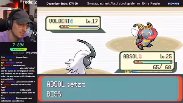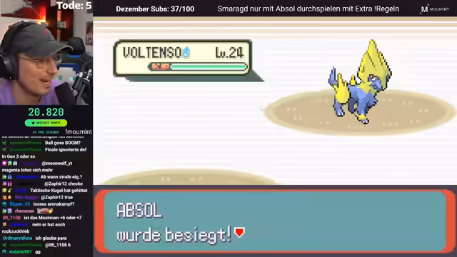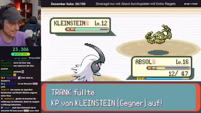 01:20:06Der Stream beginnt mit der Challenge, einzig ein Absol durch die gesamte Generation Smaragd zu spielen. Die erste Herausforderung ist ein Kampf gegen den Arenaleiter, der mit Pokémon des Gesteins-Typs antritt. Da Absol nur Kratzer zur Verfügung hat, wird die Strategie entwickelt, den gegnerischen Verteidigungswert mit der Attacke Silberblick zu senken, um dann mit Ruckzuckhieb die Schadenswirkung zu maximieren. Obwohl mehrere Felsgraben-Angriffe im Detail analysiert werden, um die Chance auf einen Sieg zu bewerten, scheitert der erste Versuch am Ende.