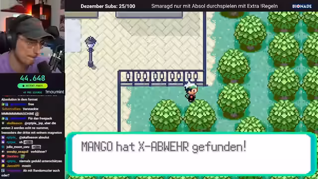 00:55:00Nachdem alle Vorbereitungen getroffen sind, startet der Streamer das Spiel Pokémon Smaragd in deutscher Sprache. Er erwähnt, dass das Spiel an einer einzigen Stelle verändert wurde: Er hat die Map editiert, um das lästige Gras-Farming am Anfang zu entfernen. Bei der Starterwahl muss das Publikum entscheiden, welches Absol er nimmt. Nach einer Abstimmung und einer strategischen Rücksprache über die Fähigkeit des Rivalen wird das rechte Absol gewählt. Absol ist ruhig und hat die Todes-useless-Fähigkeit Superschicks.