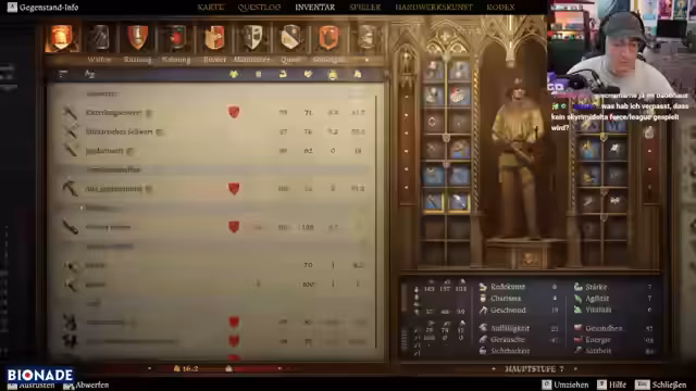 01:20:50Es wird überlegt, wie man am besten vorgeht, um eine Armbrust zu bekommen und gleichzeitig den Dolch für bestimmte Aktionen nicht zu verlieren. Das Verstecken wird als taktische Option in Betracht gezogen, um Gegner von hinten anzugreifen. Der Spieler experimentiert mit verschiedenen Kampftechniken, einschließlich des Versuchs, Gegner umzuhauen, und passt seine Strategie im Laufe des Kampfes an. Es wird festgestellt, dass die Drops auf Twitch wahrscheinlich für Ingame-Items und nicht für einen Key sind. Der Spieler analysiert die eigenen Bewegungsmöglichkeiten im Kampf und stellt fest, dass diese eingeschränkt sind, was die Situation erschwert. Nach mehreren Versuchen gelingt es, einen Gegner zu besiegen, wodurch neue Ausrüstung freigeschaltet wird. Es wird die erhaltene Ausrüstung bewertet, darunter eine Böhmische Mütze und alte Jagd am Brust, wobei entschieden wird, welche Gegenstände behalten und welche weggeworfen werden sollen, um nicht überladen zu sein.