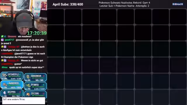 00:12:45Nach einigen Abschweifungen und persönlichen Themen wie Fahrstunden und Führerschein, kehrt der Streamer zum eigentlichen Spielinhalt zurück. Er befindet sich in Jim 5 und muss das Level Cap von 31 erreichen. Sein aktuelles Team besteht aus Ryomaso als Lead-Pokémon, Egelsamen als Träger, sowie neu gefangenen Pokémon wie dem Eisflieg Skipper. Das Team ist jedoch schwach und hat bereits Pokémon verloren, was einen Neuauffang erforderte.