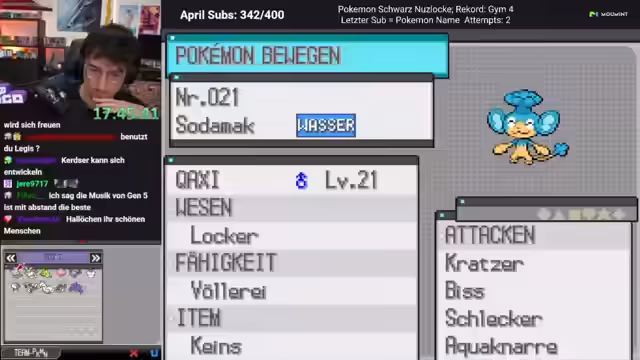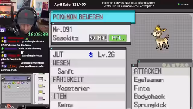 00:12:15Der Streamer gibt einen Überblick über den aktuellen Stand seiner Pokémon Schwarz Nuzlocke. Er befindet sich vor Jim 5 mit einem Level Cap von 31. Er analysiert sein Team, darunter Voltwechsel, Ryomaso und Skipper, und erinnert sich daran, dass er bei der letzten Arena zwei Pokémon verloren hat. Er plant, Tränke zu kaufen, um nicht so oft zurücklaufen zu müssen. Im PC befinden sich noch lebende Pokémon, darunter eine Ente, und er trauert um den Verlust von Brana-Watz. Er überlegt, welche Pokémon er ins Team aufnehmen soll, und entscheidet sich letztendlich für die Katze, da die anderen noch Stufe 1 Entwicklungen sind. Er erwähnt, dass es Neuigkeiten zum Bionade-Sponsoring gibt und dass der Versand aufgrund von Krankheitsfällen verzögert ist.