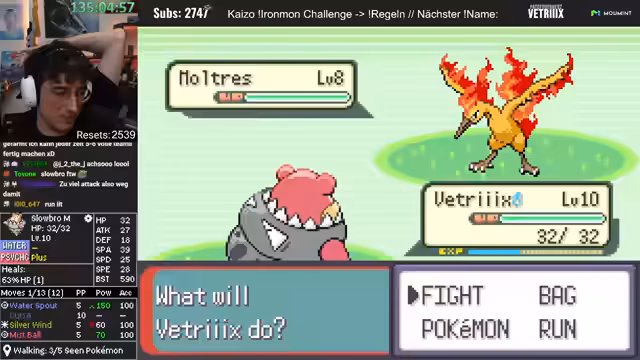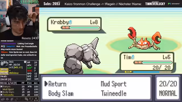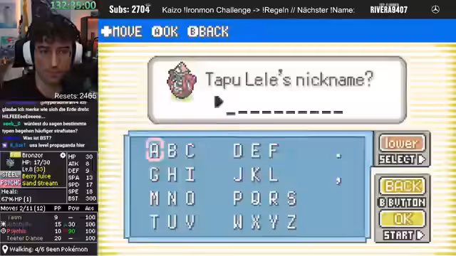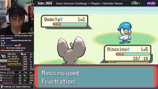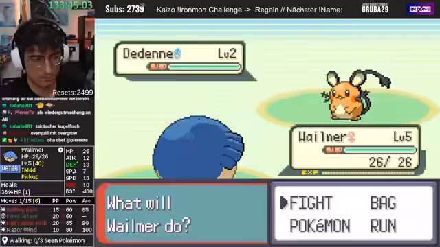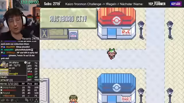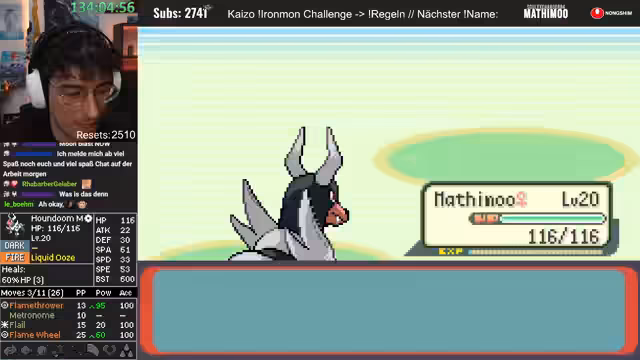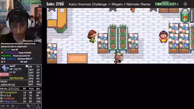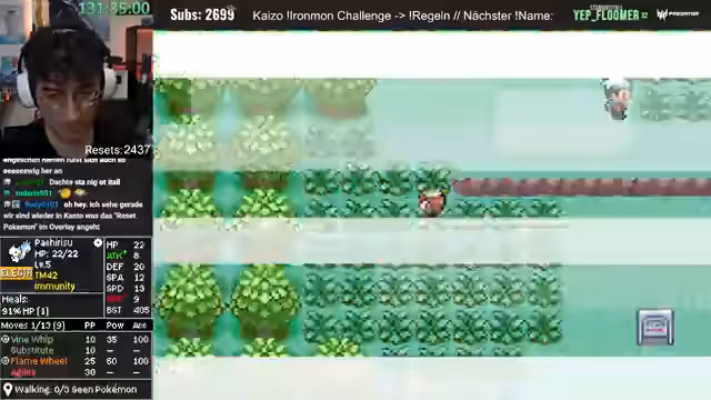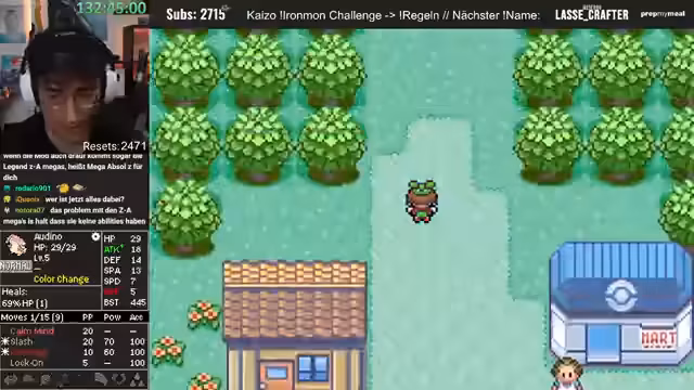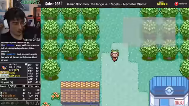 00:41:02Es findet eine Diskussion über die Spielmechaniken von Pokémon Ironmon statt. Der Streamer erklärt, dass alle Pokémon-Stats, Moves und Entwicklungen in dem Moment feststehen, in dem der Titelscreen erscheint, also wenn das Spiel neu gestartet wird. Resetten ist laut Regeln erlaubt, um sich einen neuen Seed zu generieren. Es wird angemerkt, dass die Resets bald die Subs überholen könnten.