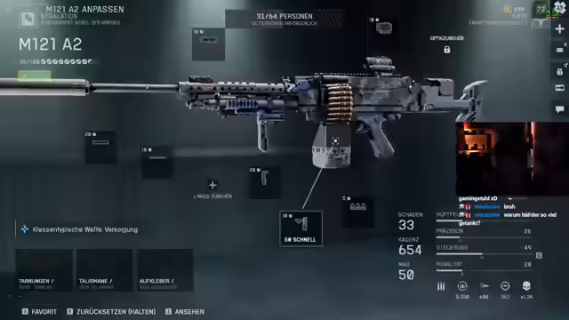 08:58:57Der Streamer wechselt das Spiel von Pokémon zu Battlefield, um neue Waffen aus einer aktuellen Season zu testen. Es werden verschiedene Waffen wie das Sturmgewehr VCR 2 und das LMG mit Aufsätzen wie Schalldämpfer und schnellem Magazin ausgiebig getestet, um deren Performance im Kampf zu evaluieren.