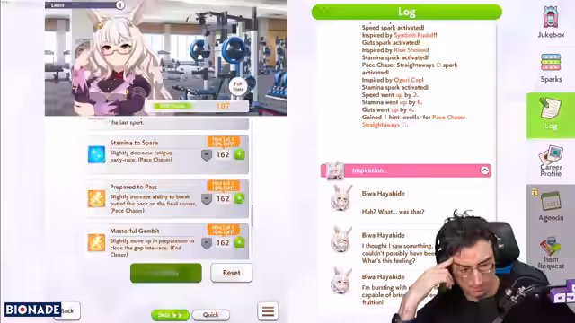 01:32:17Nach anfänglichen Versuchen, das Pferd als Pace Chaser zu spielen, wird der Spielstil grundlegend geändert. Der Fokus weicht von einer nachfolgenden auf eine führende Strategie, die als Frontrunner bezeichnet wird. Um diesen neuen Stil zu unterstützen, werden die Attribute Guts und Speed gezielt verbessert, da Guts als alternativer Ausdauerwert fungiert. Das Ziel ist es, im Rennen eine führende Position zu beziehen und diese ins Ziel zu tragen.