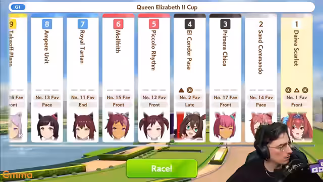 02:02:35Nachdem der Frontrunner-Ansatz zu scheitern droht, wird die Strategie erneut angepasst. Diesmal wird das Pferd explizit als Pace Chaser positioniert. Die Trainingskarten werden entsprechend angepasst, um die speziellen Attribute für diesen Spielstil, wie zum Beispiel Sprint und Slick Surge, zu fördern. Die Teilnahme am prestigeträchtigen Queen Elizabeth Cup wird angekündigt, um Fans und Prestige zu gewinnen.