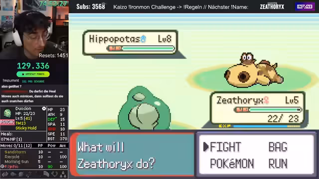 03:22:16Der Streamer analysiert intensiv die Kämpfe und die Attributsverteilung seiner Pokémon. Er äußert Frustration über eine unausgewogene Stat-Verteilung, insbesondere bei einem Death-Set, und diskutiert alternative Strategien. Ein vielversprechendes Sand-Stream Aerodactyl wird als stark eingestuft, jedoch wird der Sieg als unwahrscheinlich angesehen. Die Konzentration liegt auf dem Versuch, ein E-Mär zu fangen, das als Schlüsselpokemon für den Sieg gilt. Die Herausforderungen des Nativ-Dex Kaizo Modus werden als besonders nervig und langwierig beschrieben.