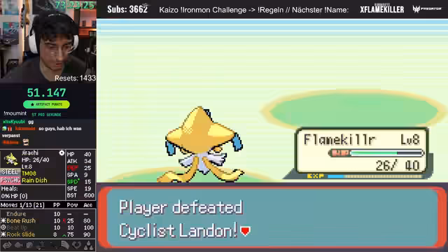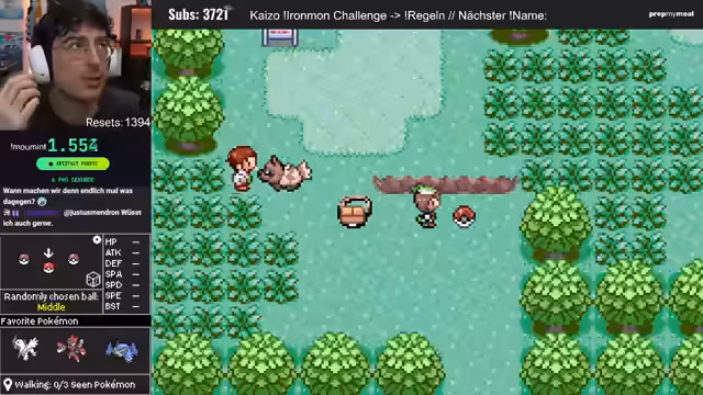 01:40:27Obwohl ein Pokémon stark aussieht, scheitert der Run an seiner zu niedrigen Geschwindigkeit (Speed). Der Streamer diskutiert über die schmerzhafte Erfahrung, ein mächtiges Pokémon zu erhalten, das dennoch durch die Spielmechanik aussortiert werden muss. Er spricht über den Frust, der mit dem hohen Zufallsfaktor (RNG) verbunden ist, und versichert der Community, dass dies Teil des Marathon sei und er auch scheißige Pokémon riskieren würde, wenn es aussichtsreich erscheint.