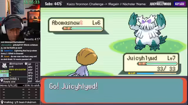 01:22:03Nach dem verlorenen Kampf wird ein neues Pokémon aus der Level-1-Evolution gefangen, das sich zu einem kraftvollen Staraptor entwickeln kann. Durch eine Attacke mit dem Light Ball gelingt dem Streamer ein K.O. gegen einen Gegner, der als stark galt. Das neue Pokémon trägt sofort zum Erfolg bei. Jetzt muss nur noch verhindert werden, dass es durch gegnerische Moves stirbt, bevor es sich entwickeln kann.