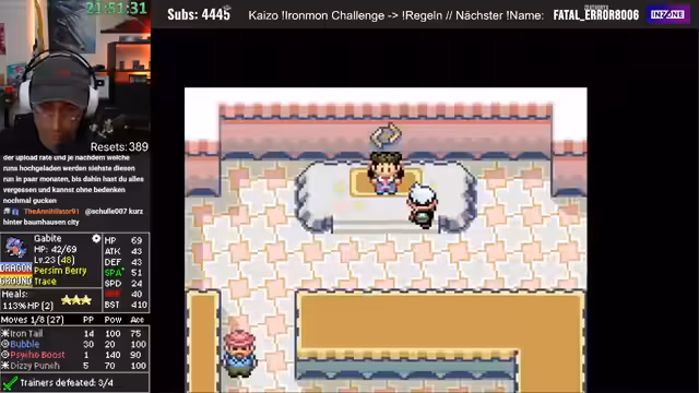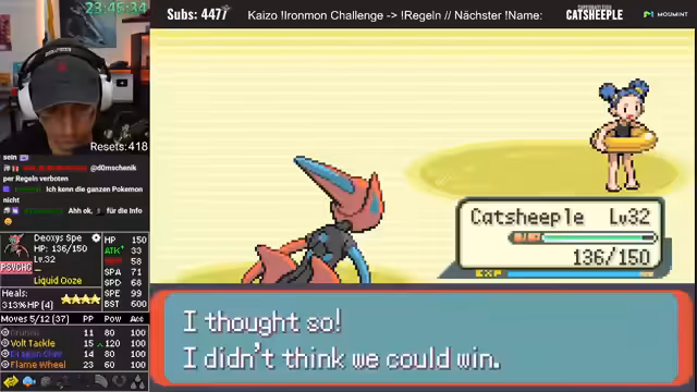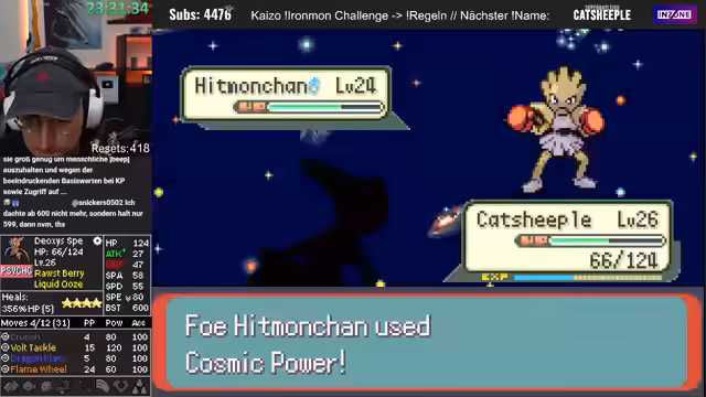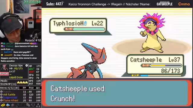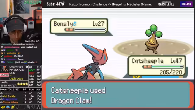 04:27:39In der Arena wird ein Hase-Pokémon angetroffen. Ein Missklick, der versehentlich Mistball anstelle von Crunch nutzt, stellt sich jedoch als game-changer heraus, da der Gegner durch den hohen Schaden stirbt. Dieser Fehlgriff rächt sich früher, als der Gegner Spiegelscape einsetzt. Die Stats des eigenen Deoxys werden als 'kacke' beschrieben, und der Streamer ist erstaunt, dass es nur durch seine Moves überlebt. Der Sieg in der Arena und das Erhalten des Heat Badges werden gefeiert.