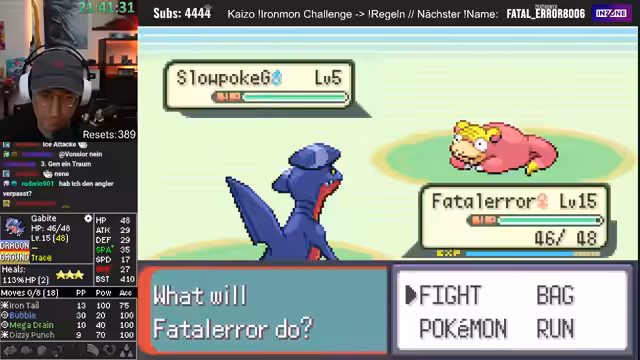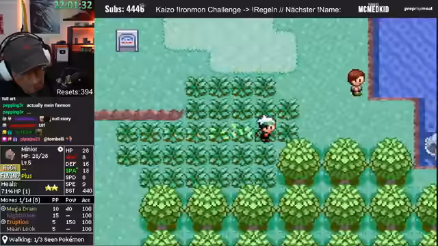 00:18:48Das Hauptspiel beginnt mit der Rückkehr zu einem bekannten Fisch-Pokémon, das seit Stunden im Team ist. Der Streamer muss nachholen, wo die letzte Session geendet hat. Gemeinsam mit dem Chat wird das Ziel definiert: Der Kollege Birch muss gerettet werden. Das Team besteht aus unterdurchschnittlich starken Pokémon, was den Run schwierig macht. Nach einem verlorenen Kampf gegen einen Arenaleiter wird das Spiel zurückgeladen.