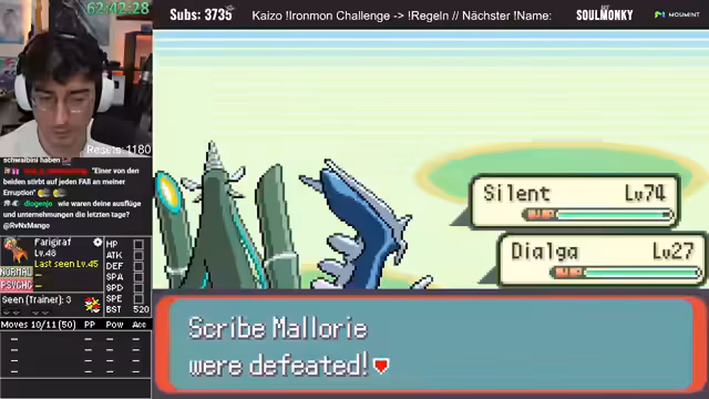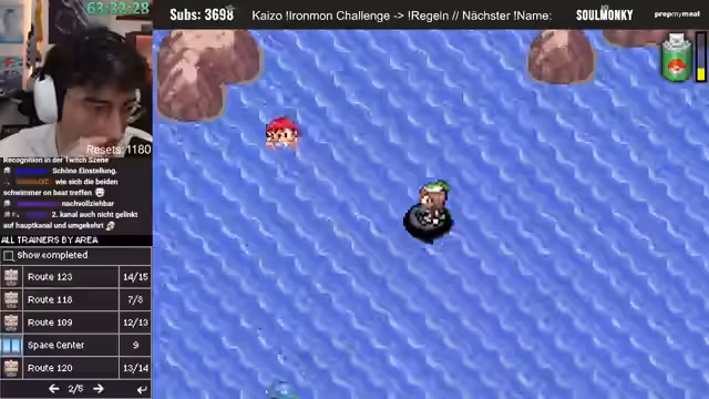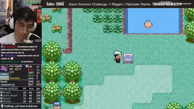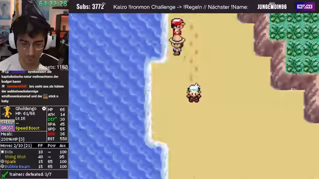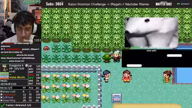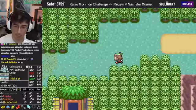 01:02:38Nachdem die Pokémon Presents zu Ende sind und der Streamer sich eine Pause gönnt, wechselt er zum eigentlichen Gameplay-Teil des Streams. Man startet einen Ironmon-Lauf von Pokémon Smaragd Kaizo. Der Streamer sucht den letzten Savepoint und stellt das aktuelle Team vor, insbesondere ein starkes Stahl-Flug-Pokémon mit hoher Special Attack. Er befindet sich in der Phase des XP-Farmings und will mit dem Surfer-Doppelkämpfe durchführen, während er auf das nächste Level-Up wartet, um eine neue Attacke zu lernen.