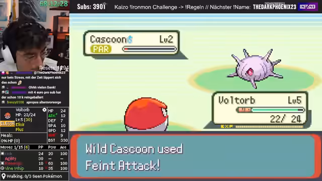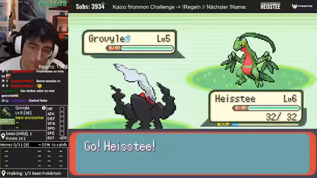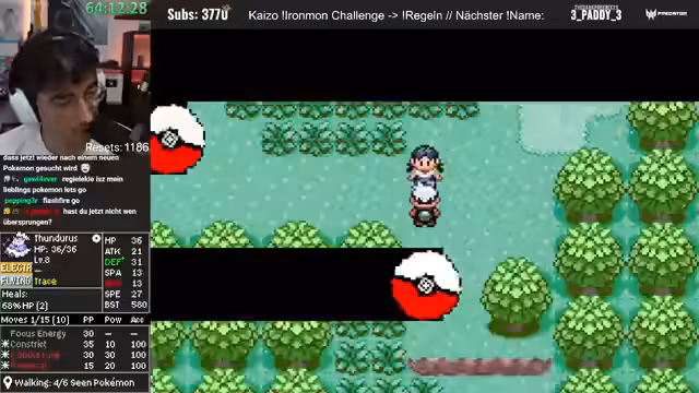04:21:27Nach einem verlorenen Kampf wird der Ironmon-Run fortgesetzt. Der Streamer fängt ein neues Pokémon, das jedoch nur eine durchschnittliche Statverteilung aufweist. Bei der Jagd auf ein neues, besseres Pokémon wird ein Starter als potenzielle Bombe mit extremem Potenzial identifiziert, da es einen starken Move wie Sketch lernen könnte. Allerdings wird auch erkannt, dass ein Level-up auf 37 für den Payoff zu lange dauern könnte.