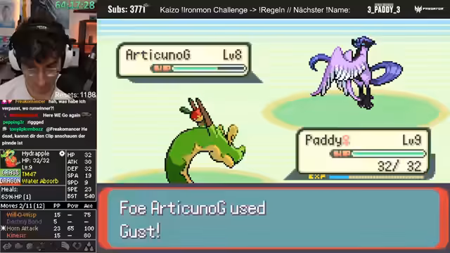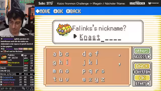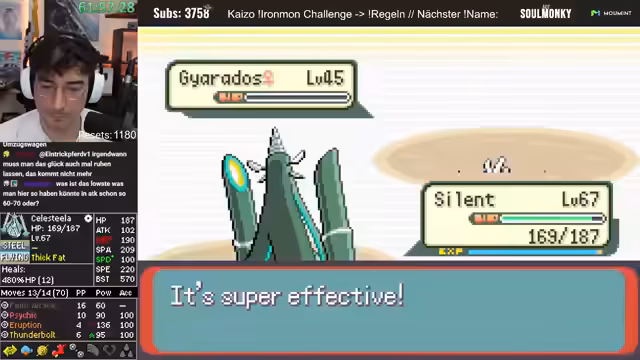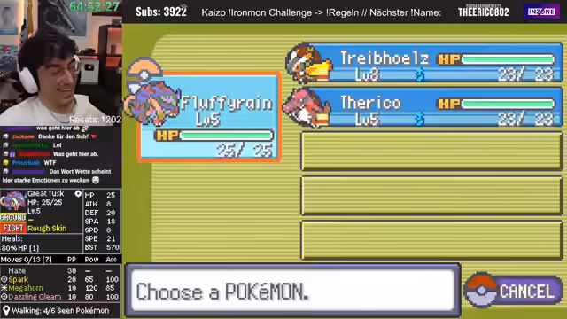 04:28:16Der Stream interagiert stark mit dem Chat, ignoriert aber Spenden und Abonnements. Stattdessen werden Wetten und Vorschläge der Chat-Mitglieder aufgegriffen. Ein Pokémon mit einer Minus-Natur wird als_moveset-technische Katastrophe eingestuft. Ein anderes Pokémon mit Dragon Rage wird als hochinteressant und potent für die Zukunft des Runs bewertet, sobald es den passenden Move wie Sketch erlernt.