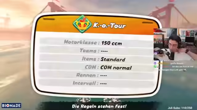 00:07:10Für den heutigen Stream sind mehrere Aktivitäten geplant. Mango ist sich noch nicht über die genue Reihenfolge im Klaren, ob zuerst Mario Kart und dann 'Der dümmste fliegt' oder umgekehrt stattfinden soll. Es wird auf ein geplantes PUBG-Event in drei Wochen hingewiesen, bei dem Mango bereits Teilnahme zugesagt hatte. Beim anschließenden Aufbau des Mario Kart-Turniers treten Probleme mit der Lobby-Erstellung auf. Mango muss feststellen, dass sich die Steuerung unerwartet verändert hat, und erklärt, warum er seine Antenne in Mario Kart immer an lassen muss, um nicht aus dem Auto zu fallen. Letzter in einer Runde muss eine Strafe zahlen, auch wenn der Spaß im Vordergrund steht.