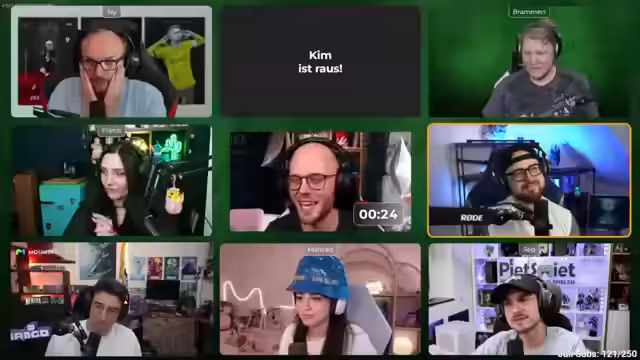 02:21:10Das erste gemeinsame Spiel startet, nachdem alle technischen Hürden genommen wurden. Bram fungiert als Moderator und stellt die erste Frage. Die Teilnehmer müssen unter Zeitdruck diverse Fragen aus verschiedenen Wissensgebieten beantworten. Jay beginnt und beantwortet die Frage nach der Schreibweise von "Interesse" korrekt. Die Runde ist geprägt von kurzen, schnellen Antworten, teilweise falschen Annahmen und humorvollen Skippen der Fragen. Nach Ablauf der Zeit stehen die Teilnehmer fest, die es in die nächste Runde schaffen.