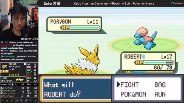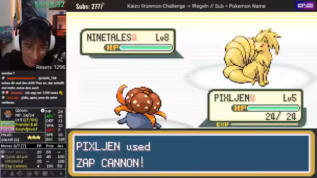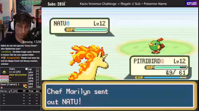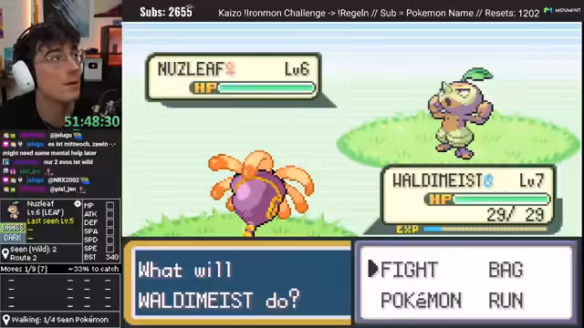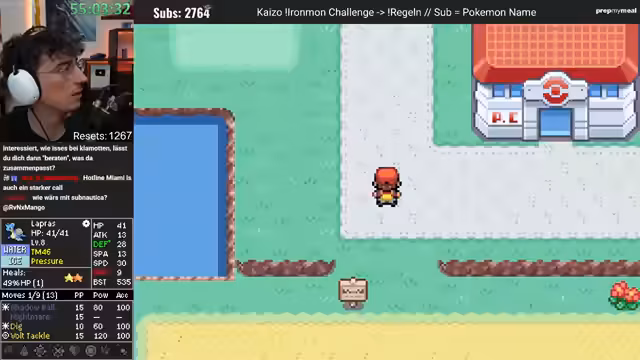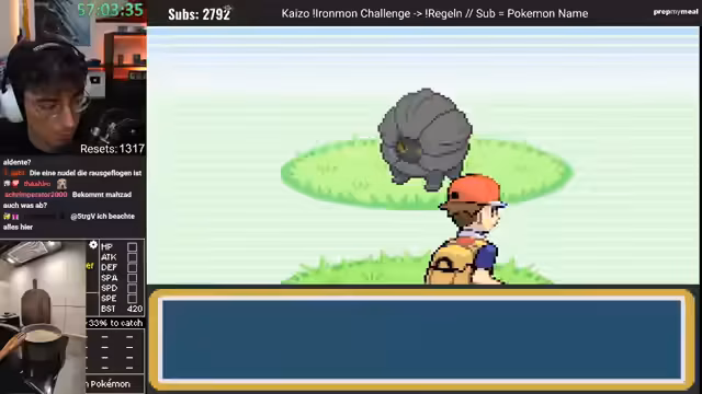 02:48:58Nachdem der erste Run gescheitert ist, beginnt ein neuer Versuch mit dem Fang von Florio Leno. Das gefangene Pokémon entwickelt sich zu Diktri, dessen Werte ebenfalls unbefriedigend sind. Der Streamer fängt daraufhin ein weiteres, deutlich besseres Pokémon: PZKWaff. Dieses Pokémon hat zwar einen sehr niedrigen Geschwindigkeitswert, bietet aber ein exzellentes Moveset mit Fight-Winning-Burn und weiteren starken Attacken. Trotz der anfänglichen Euphorie über die guten Werte und das Moveset, fällt auch dieser Run später einem unfairen Kampf zum Opfer.