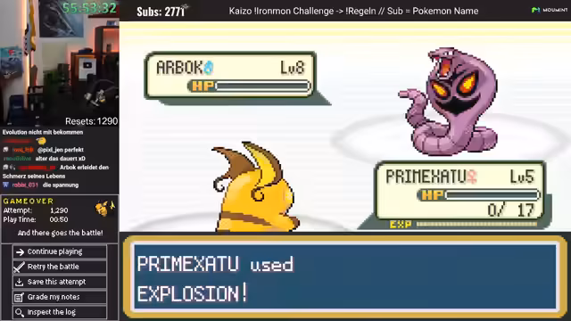 04:52:02Nachdem das vorherige Pokémon scheitert, beginnt der Streamer einen neuen Run und konzentriert sich auf das Gambling nach einem Feuerstein. Er erklärt, dass die Evolution von Fucano zu Glurak nicht lohnt, da es nicht stark genug ist und es bessere Alternativen gibt. Er entscheidet sich dafür, den Feuerstein zu gamble, oder pivoten zu einem anderen Pokémon, da es die bessere Wahl ist.