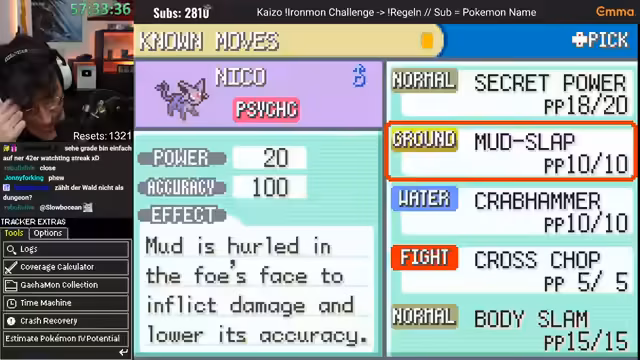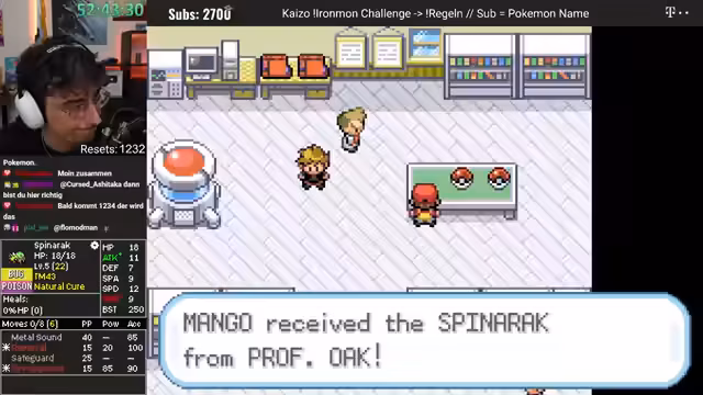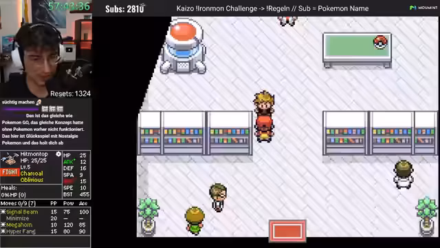 00:04:17Der Stream beginnt mit dem Ziel, an die 2000 Resets eines Kaizo Ironman-Runs heranzuführen. Der Streamer begrüßt das Publikum und formuliert eine positive, optimistische Erwartungshaltung bezüglich des Glücks bei der Wahl der Start-Pokémon. Die Initialen Zahlen und Resets werden erwähnt, und der erste Kampf gegen den Waldmeister beginnt. Die Begegnung mit einem Holy-Geldimon stellt sich als vorteilhaft heraus und wird nach einem knappen Sieg gefangen, was als exzellenter Start für den Run bewertet wird.
