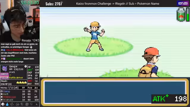 Es wurde ein kompletter Road-to-2000-Kaizo-Ironman-Run dokumentiert. Zunächst wurde ein starker Start mit einem Holy-Geldimon und einem strategisch gefarmten Schigxy verzeichnet. Ein gefangenes Gengar galt als Schlüsselpokemon, wurde jedoch im Chat wegen seiner niedrigen Geschwindigkeit kritisiert. Dies führte zu einem humorvollen 'Diktator'-Meme. Trotz eines Sieges gegen den Erzrivalen wurde der Run als gescheitert bewertet, nachdem das Gengar als statistisch unspielbar eingestuft wurde.