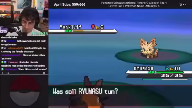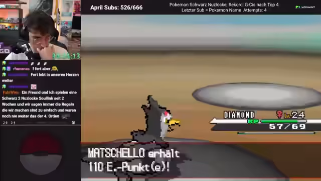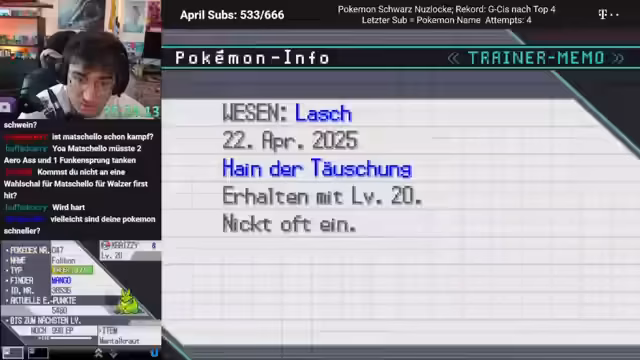 04:29:21Nach dem Verlust eines Pokémons wird die Jagd auf ein neues Teammitglied fortgesetzt. Das Ziel ist es, einen Hund oder eine Katze zu fangen, da der Streamer ohne diese Typen im Nuzlocke-Run in Schwierigkeiten gerät. Er kehrt in den Apfelbau zurück, wo er eine Begegnung hat, und findet schließlich einen Hund, der sich als sehr nützlich erweist. Die Freude über das neue Mitglied, Apfelbauer, ist groß, aber der Streamer warnt gleichzeitig, dass es wahrscheinlich als erstes wieder geopfert werden muss, da es in ein riskantes Match-Up involviert ist.