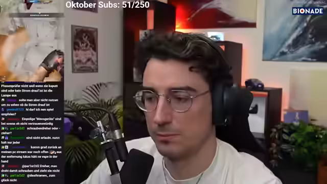 00:03:58Es wird nach einer vierten Person für das Spiel 'King of Meat' gesucht, da nur drei Spieler verfügbar sind. Der Streamer versucht, über seine Mods oder andere Kontakte jemanden zu finden, der zwischen 19 und 21 Uhr Zeit, einen PC und ein Mikrofon hat. Dabei wird erwähnt, dass 'King of Meat' im Grunde 'Fall Guys' mit mehr Lore und Dungeons ist. Währenddessen treten technische Probleme auf, da die Spielgröße nicht gespeichert wird und der Sound lauter als gewöhnlich ist. Es wird auch kurz über die Exklusivität von Bionade-Shirts von der Gamescom gesprochen, die angeblich für 500 Euro versteigert werden könnten.