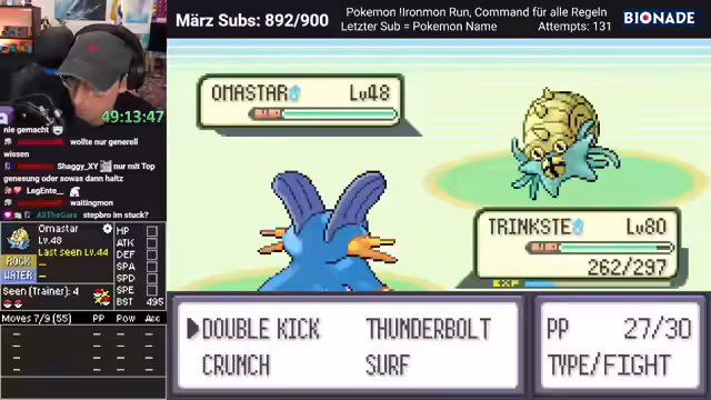 00:41:10Nach einer längeren Abschweifung und einem musikalischen Intermezzo kehrt der Streamer zum Hauptinhalt des Tages zurück: dem Pokémon SMARAGD IRONMON. Er gibt einen Überblick über den aktuellen Stand des Laufs. Nachdem sein letztes Pokémon 'Turtok' in der Arena gestorben ist, hat er ein neues Pokémon, 'Sumpex', erhalten, das bereits stark überlevelt ist. Das Ziel ist es, Rayquaza zu fangen. Der Streamer nennt als prioritäres Ziel das Training von 'Macho Mai' als potenzielles Einsatz-Pokémon für den finalen Kampf gegen Steven und erläutert die strategischen Überlegungen dahinter.