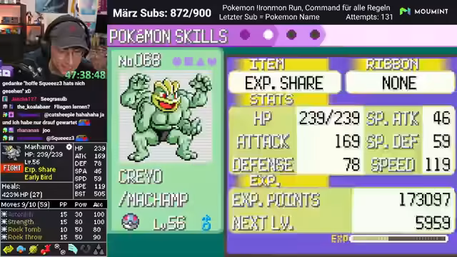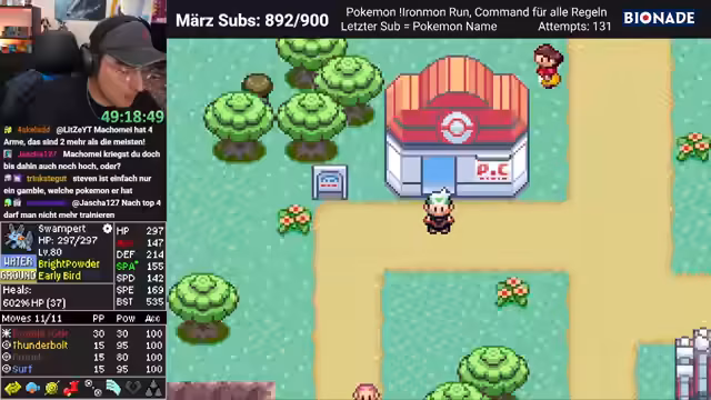 01:53:12Der Streamer teilt Kindheitserinnerungen an Pokémon Smaragd und andere Editionen, einschließlich einer Geschichte, wie er eine verlorene Edition Jahre später wiederfand. Er bedankt sich bei einem Zuschauer für eine geschenkte Edition. Es wird überlegt, welche Editionen der Streamer besitzt. Es wird klargestellt, dass in Standard Ironmon Attacken nur einmal benutzt werden dürfen und Legendaries erlaubt sind, wenn sie die Favoriten sind oder sich Pokémon in Legendaries entwickeln. Der Streamer erzählt von gelöschten Spielständen in seiner Kindheit. Es wird festgestellt, dass Creo eine Luster-Purch von einem Latios tanken kann. Der Streamer bedankt sich für einen Prime Step. Das Münz-Amulett wird als nutzlos angesehen, da der Streamer zu viel Geld hat und nichts kaufen darf. Es wird überlegt, ob Bright Powder oder Scope Lens besser ist. Der Streamer entscheidet sich für Bright Powder. Es wird ein Magma Emblem gefunden. Der Mount Pyre wird geschafft. Der Streamer macht Wheelie. Es wird überlegt, ob Erdbeben Sumpex trifft. Der Streamer ist sich nicht sicher, ob Surfer alle trifft. Der Streamer vertraut nur noch Informationen, wo ein Modzeichen vor dem Namen steht. Ein Elixier wird gefunden. Der Streamer erinnert sich daran, dass der zweite Boss einen Kamerob mit Erdbeben hatte, das immer den Entei gekillt hat. Es wird beschlossen, heilen zu gehen, bevor die Team Magma Typen getötet werden.