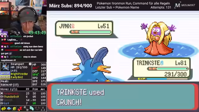 04:56:16Nach der erfolgreichen Jagd und dem Fang von Rayquaza wird das Team um ein weiteres neues Mitglied erweitert, das sofort in die aktive Rotation aufgenommen wird. Die Vorbereitung auf den Endgame des Runs beginnt, mit dem Ziel, alle Trainer in der Top-4-Arena zu besiegen. Der Streamer zeigt sich selbstbewusst, erkennt aber gleichzeitig die immense Gefahr durch Steven. Er plant, die aktuelle Session mit dem Beginn des Kampfes gegen die Arena zu beenden, was den Zuschauern einen dramatischen Cliffhanger beschert.