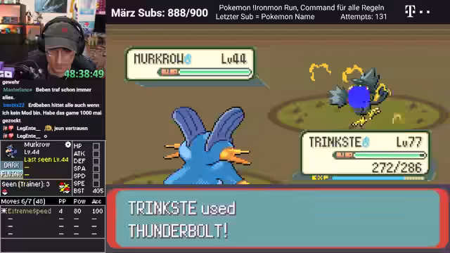 04:42:04Nach einer langen Vorbereitung und Diskussionen über die möglichen Pokémon, die auftauchen könnten, ist es soweit: Rayquaza erscheint. Der Streamer erinnert die Chat-User daran, anhand der typischen Schreie der Pokémon erraten zu können, welches Pokémon es tatsächlich ist, was die interaktive und spannungsreiche Atmosphäre der Begegnung steigert. Dies ist der Höhepunkt der aktuellen Session und der Wendepunkt in der Handlung des Iron-Man-Laufs.