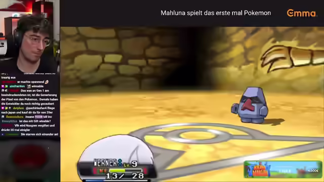 04:11:44Es wird der erste Rivalenkampf gegen Hydropie ausgetragen, wobei erklärt wird, welcher Typ Nachteil auf Wasser hat. Es wird ein Trank eingesetzt, um sich zu heilen. Hydropy wird besiegt, und es werden Erfahrungspunkte gesammelt. Es wird überlegt, wann die Erdbeere gegessen wird. Nach dem Besiegen des Rivalen wird der Textabob auf 3 gestellt. Es wird der Pokémon-Markt besucht, um Pokébälle zu kaufen. Es gibt Probleme mit der Discord-Übertragung, und alternative Lösungen wie OBS Ninja werden vorgeschlagen. Es wird versucht, den Ton in OBS einzustellen.