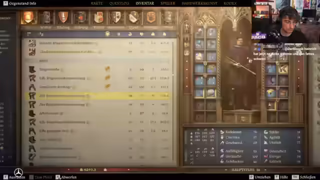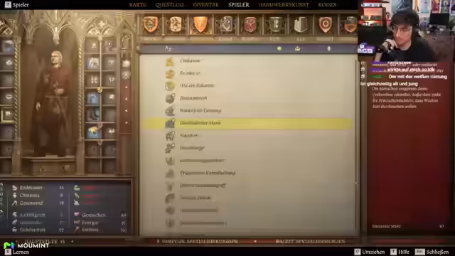 01:45:17Im Stream werden verschiedene Skills in Betracht gezogen, wie der Einsatz eines Kampfschreis, der einen Bonus im Kampf oder beim Umgang mit Frauen gewähren könnte, sowie Redekunst und Heimlichkeit. Auch werden Vorteile des Skills Schwert analysiert, der durch aufeinanderfolgende Angriffe mehr Schaden verursacht. Bei der Ausrüstung wird ein Schild als nützlich erachtet und ein Hahnschreitrank zur Erhöhung der Energie konsumiert.