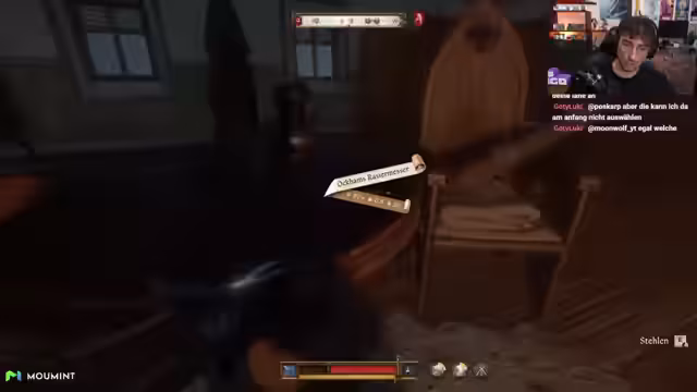 01:32:36Der Streamer erreicht das Gemach des Burgherrn und findet den Schlüssel in einer Truhe. Gleichzeitig entdeckt er einen Dolch und einen Heiligkeitsapfel, die ihm von Nutzen sein könnten. Sein Ziel ist es, den Schlüssel zu besorgen und unauffällig wieder aus dem Raum zu verschwinden, ohne Aufmerksamkeit auf sich zu ziehen und dabei möglichst wenig Geräusch zu machen.