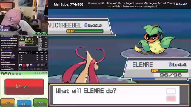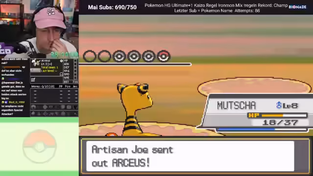 00:42:12Nachdem ein neues Pivot-Pokémon gefunden wurde, bricht der Streamer in die erste Arena auf. Die Begegnungen dort sind laut ihm ungewöhnlich, da er starke Pokémon wie Dialga, Deoxys und Rayquaza trifft. Das Team kämpft sich mühsam durch, wobei der Fokus auf PP-Sparung und dem Einsatz von Attacken wie Dragon Breath und Water Pulse liegt. Trotz eines erfolgreichen Vormarsches stirbt das wertvolle Starter-Pokémon Psiana im Kampf gegen den Arenaleiter Mewtwo aufgrund eines zu niedrigen HP-Wertes und eines kritischen Treffers, was den Run abrupt beendet.