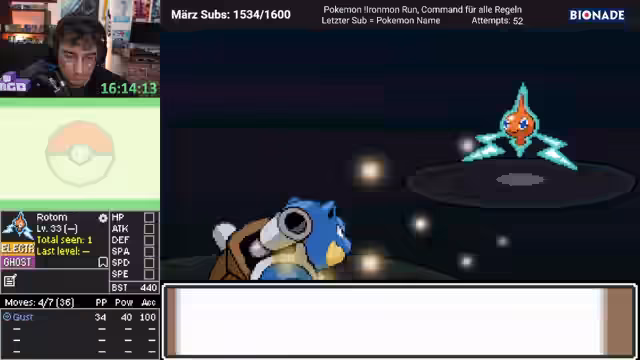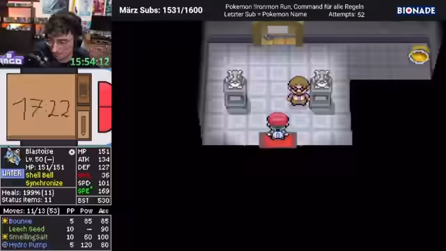 00:08:45Die zentrale Mission des Runs ist es, ein Turtok mit perfekten Werten zu entwickeln und es am Ende des Runs zu haben. Das Team hat dank Pokerus bereits perfekte EVs auf zwei Statuswerten gesichert. Der Fokus liegt nun darauf, Turtok schnell zu leveln und ihm starke Attacken wie Smelling Salt und später Hydro-Pumpe beizubringen. Der Streamer diskutiert die Wahl der vierten Attacke, wobei Sword Dance als spätere Option als stark eingestuft wird.