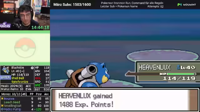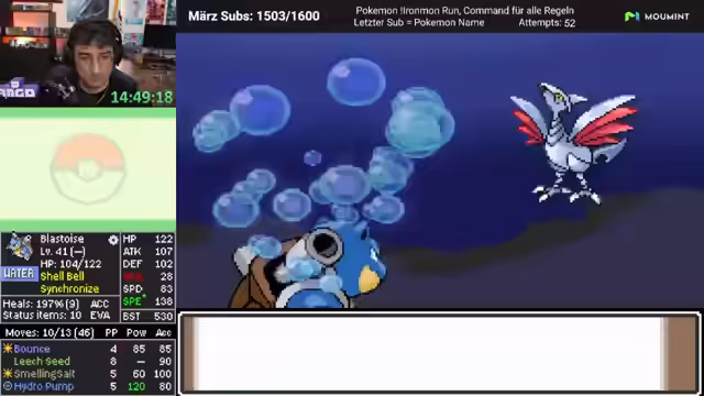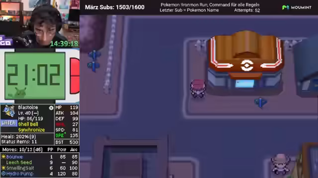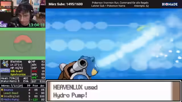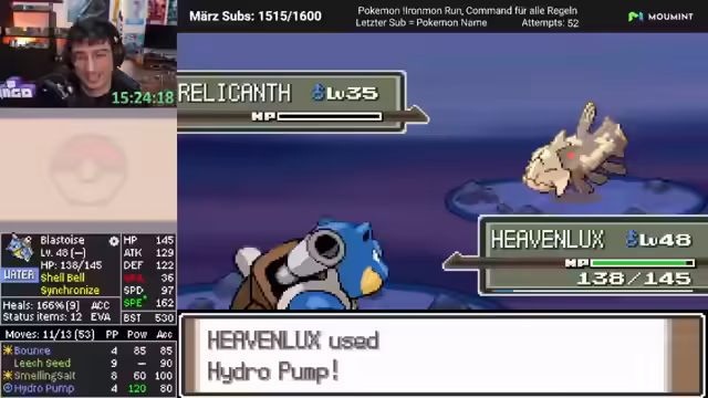 03:46:04Nach einem langen Zeitraum ohne Heilmittel wird endlich wieder ein Pokémon geheilt. Der Streamer gibt einen kurzen Recap: Der Run lief bisher größtenteils ohne Crashes, aber die schlechte Attackenauswahl von Turtok bleibt das Hauptproblem. Um dies zu beheben, werden neue Pokémon in das Team aufgenommen, darunter ein stabiler 'Skali' und ein weiterer 'Moonwolf'. Dies stärkt das Team, auch wenn die Coverage-Lücken weiterhin bestehen.