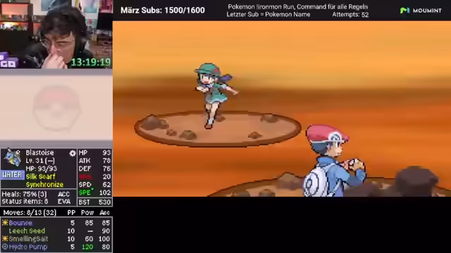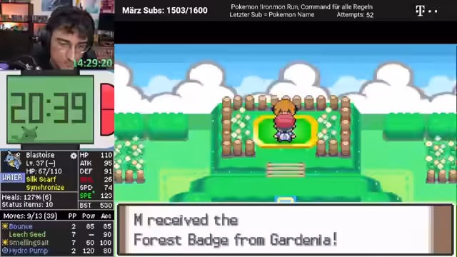 01:01:16Der Streamer begegnet der Arena-Leiterin Flora, deren Team aus einem gefährlichen Shuckle und einem Pokémon besteht, das einen Solarstrahl besitzt. Der Kampf wird taktisch mit Lee Samen bestritten. Shuckle wird mit zwei Treffern der Hydro-Pumpe besiegt. Das finale Pokémon durchsticht den Lee Samen und muss sich nach dem Einsatz einer Beere ergeben. Der Sieg wird mit strategischem Wiedereinsatz von Bounce und unvorhergesehenen Fehltreffern des Gegners errungen.
