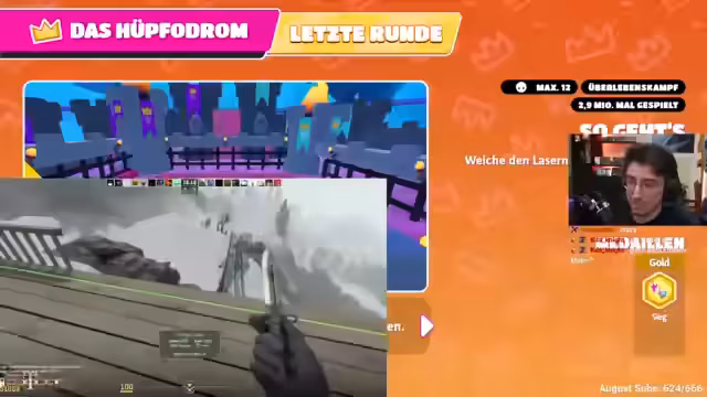00:11:24Nach den anfänglichen technischen Problemen beginnt das tatsächliche Gameplay in Fall Guys. Der Streamer und andere Spieler bewegen sich durch verschiedene Levels und Maps. Es gibt häufige technische Probleme, wie zum Beispiel Audio-Latenz und ungleiche Lautstärke zwischen den Spielern. Der Streamer äußert Frustration über die unübersichtlichen Maps und die Schwierigkeit, das Spiel nach längerer Abwesenheit wieder zu erlernen.