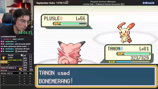 00:09:53PIXI, ein gutes Pokémon, befindet sich bei Level 39 und hat einen Vorsprung. Das Hauptziel ist weiterhin, eine starke Attacke zu finden. Der Streamer kämpft mit Attacken wie Crush Claw und Bommerang, wobei er besonders die geringe Anzahl an PP und das Fehlen von PP-Top oder PP-Max als problematisch ansieht. Einige Kämpfe, wie gegen Granbull, werden aufgrund von PP-Sparen und der Gefahr, getötet zu werden, als nervig und riskant beschrieben. Der Streamer stellt fest, dass es sich bis auf die Attacken um einen Traumrun handelt.
