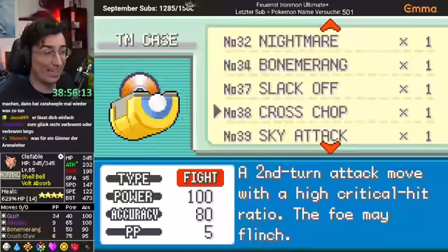 03:00:05Der Streamer bereitet sein Team intensiv auf die bevorstehenden Top 4-Kämpfe vor. Er stellt sicher, dass seine Attacken wie Crash Claw und Bonerang ausreichend PP haben, indem er sie mit PP Ups und Max Elixi auffüllt. Die Wahl der Attacken wird sorgfältig abgewogen, wobei er nach möglichst starken und präzisen Optionen sucht. Einige Pokémon scheinen Schwächen wie Speed-Drops zu haben, was die Taktik beeinflusst. Der Fokus liegt darauf, die Konter der Gegner zu kennen und die eigenen Moves optimal einzusetzen.