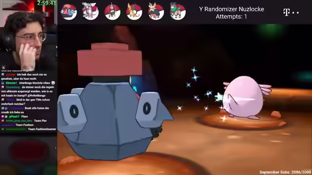 00:45:54Der Streamer fängt ein Fee-Stahl-Pokémon mit der Fähigkeit Strolch. Er stellt fest, dass er aufgrund seiner Iron-Man-Erfahrung nicht alle deutschen Pokémon-Begriffe kennt. Im Wald gibt es keine versteckten Items, aber die anderen Charaktere laufen herum. Der Streamer freut sich auf Schütze. Er erhält einen Para-Heiler und besiegt das Kampf-Team in der Arena. Er kommt dem Level-Cap nahe und erklärt, dass er die Pokémon manuell leveln müsste, wenn er ohne Sonderbonbons spielen würde. Er überspringt unnötige Kämpfe, um keine zusätzlichen Erfahrungspunkte zu sammeln. Der Streamer erklärt das Level-Cap-System und die Konsequenzen bei Überschreitung. Er erhält Tränke und andere Items. Der Streamer kämpft gegen Terrakium mit Palkia und besiegt es. Er fängt ein weiteres Pokémon und setzt Feenbrise ein. Es wird erwähnt, dass es einen Minecraft-Server geben wird, auf dem Töten nicht erlaubt ist. Der Streamer füllt das Subgoal und erreicht Nuvaria City.